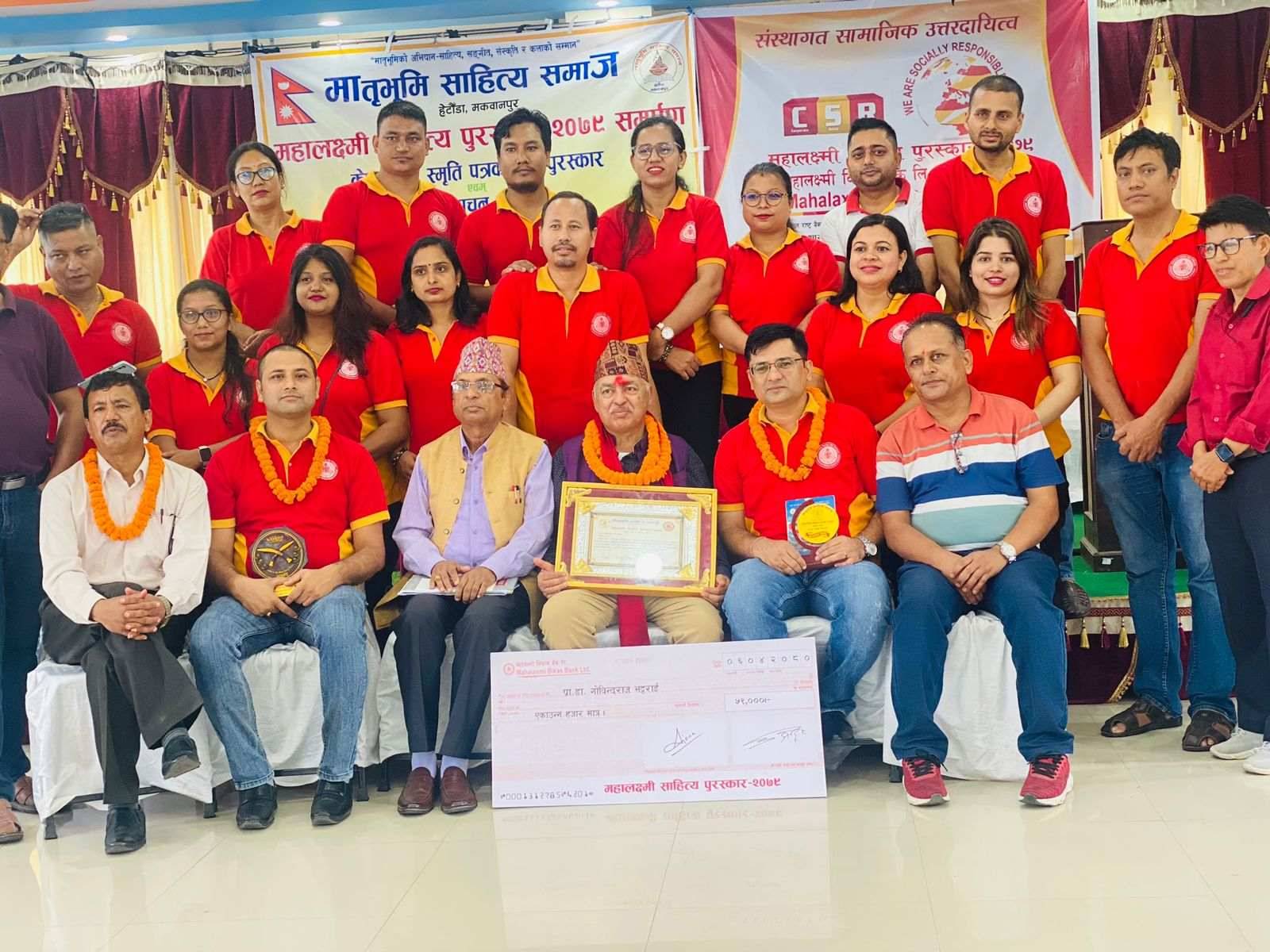 नेपाली जनताको घरदैलोमा विगत २९ वर्ष देखि अनवरत रुपले सरल, सहज र गुणस्तरिय वित्तीय सेवा प्रदान गर्दै आईरहेको महालक्ष्मी विकास बैंकका हेटौंडा शाखाले संस्थागत सामाजिक उत्तरदायित्व कार्यक्रम अन्तरर्गत मातृभुमी साहित्य समाजसँग समन्वय गरी वार्षिक रुपमा प्रदान गर्दै आइरहेको महालक्ष्मी साहित्य पुरस्कार-२०७९ द्वारा प्रा. डा. गोविन्दराज भट्टराईलाई सम्मानित गरेको छ ।