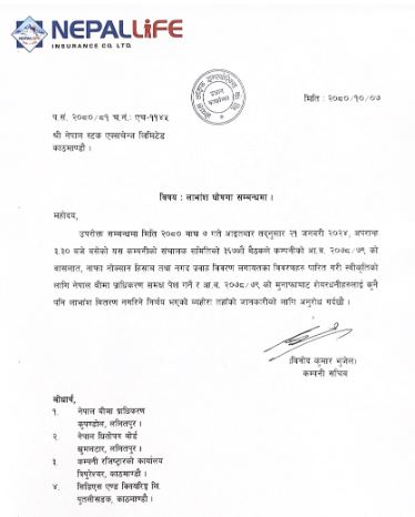 गृहपृष्ठ ∕ अर्थतन्त्र ∕ बीमा ∕ नेपाल लाइफ इन्स्याेरेन्सले लाभांश वितरण नगर्ने नेपाल लाइफ इन्स्याेरेन्सले लाभांश वितरण नगर्ने Karobarpati सोमबार, २०८० माघ ८ गते, १२:३९ मा प्रकाशित काठमाडौं । नेपाल लाइफ इन्स्योरेन्सले लाभांश वितरण नगर्ने भएको छ ।\ कम्पनील्ले अघिल्लो आर्थिक वर्ष २०७८–७९ को नाफाबाट सेयरधनीहरुलाई कुैपनि लाभांश वितरण नगर्ने जनाएको हो । कम्पनीको आइतबार बसेको सञ्चालक समितिले लाभांश प्रस्तावबिनै उक्त आर्थिक वर्षको वित्तीय विवरण स्वीकृतिका लागि नियामक नेपाल बिमा प्राधिकरणमा पेश गर्ने निर्णय गरेको हो । क्याटेगोरी : बीमा तपाईको प्रतिक्रिया दिनुहोस सम्बन्धित समाचार उद्यमशीलता बहुउद्देश्यीय सहकारी र गार्डियन माइक्रो लाइफ इन्स्योरेन्सका बीच सम्झौता क्रेस्ट माइक्रो लाइफ इन्स्योरेन्सले बोलायो सधारण सभा, आईपीओ निष्कासन विशेष… साविक ज्योति लाइफको नाफालाई रिजर्भ कोषमा राख्ने युनाइटेड अजोड इन्स्योरेन्सले १०.२६ प्रतिशत लाभांश प्रस्ताव पारित सानिमा जीआइसी इन्स्योरेन्सले कमायो १० करोड ५५ लाख नाफा नेप्सेमा हिमालयन एभरेष्ट इन्स्योरेन्सको बोनस सेयरमा मूल्य समायोजन धेरै पढिएका १ १४.७५ % भन्दा बढी ब्याज सहकारीले लिन नपाउने २ स्थिर व्याजदर योजनामा बैंकले आफूखुसी व्याज परिवर्तन गर्न नपाउने ३ बाजुराको बुढीगंगा नगरपालिकामा चुनाव जारी ४ प्रदेश २ मा मन्त्रिपरिषद् विस्तार, को को बने मन्त्री ? ५ लक्ष्मी बैंकले ८ पुसमा बोलायो साधारण सभा ६ बुटवल कोरोना अस्पतालमा दुई सङ्क्रमितको मृत्यु ७ सिभिल बैंकले २४ मंसिरदेखि ऋणपत्र निष्कासन गर्ने ट्रेण्डिङ ज्योति विकास बैंकद्वारा क्युआर कोड अडियो अलर्ट प्रविधियुक्त सेवा सार्वजनिक जीवन विकास लघुवित्तद्वारा लाभांशको घोषणा हुम्लामा पाँच महिला मतदान अधिकृत ग्लोबल आईएमई र भीजी इम्पेक्सबीच समझदारी पत्रमा हस्ताक्षर स्वावलम्बन लघुवित्तले बढायो नाफा गणपति लघुवित्तको नाफा घट्यो कामना सेवा विकास बैक र मल्पी इन्टरनेशनल कलेज बीच सम्झौता ज्योति विकास बैंकद्वारा क्युआर कोड अडियो अलर्ट प्रविधियुक्त सेवा सार्वजनिक जीवन विकास लघुवित्तद्वारा लाभांशको घोषणा हुम्लामा पाँच महिला मतदान अधिकृत ग्लोबल आईएमई र भीजी इम्पेक्सबीच समझदारी पत्रमा हस्ताक्षर स्वावलम्बन लघुवित्तले बढायो नाफा गणपति लघुवित्तको नाफा घट्यो कामना सेवा विकास बैक र मल्पी इन्टरनेशनल कलेज बीच सम्झौता